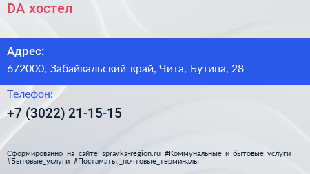 DA, хостел по адресу 672000, Забайкальский край, Чита, Бутина, 28 в дальнейшем Организация, размещена в следующих категориях: