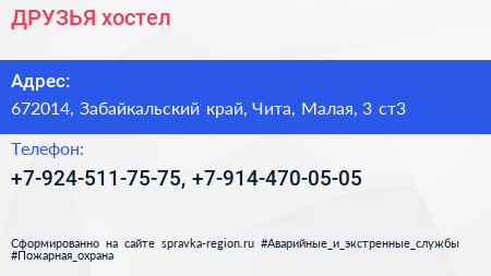 ДРУЗЬЯ, хостел по адресу 672014, Забайкальский край, Чита, Малая, 3 ст3 в дальнейшем Организация, размещена в следующих категориях: