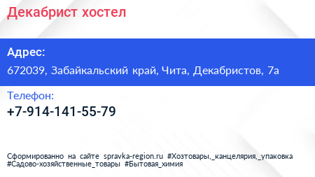 Декабрист, хостел по адресу 672039, Забайкальский край, Чита, Декабристов, 7а в дальнейшем Организация, размещена в следующих категориях: