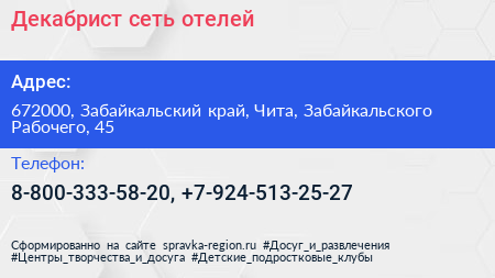 Декабрист, сеть отелей по адресу 672000, Забайкальский край, Чита, Забайкальского Рабочего, 45 в дальнейшем Организация, размещена в следующих категориях: