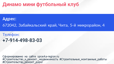 Динамо, мини-футбольный клуб по адресу 672042, Забайкальский край, Чита, 5-й микрорайон, 4 в дальнейшем Организация, размещена в следующих категориях: