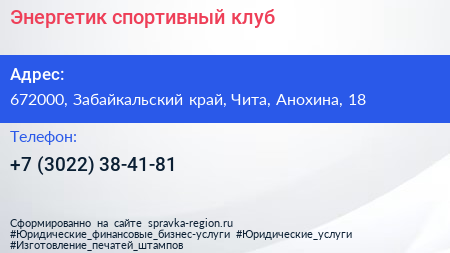 Энергетик, спортивный клуб по адресу 672000, Забайкальский край, Чита, Анохина, 18 в дальнейшем Организация, размещена в следующих категориях: