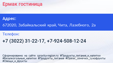 Ермак, гостиница по адресу 672020, Забайкальский край, Чита, Лазебного, 2а в дальнейшем Организация, размещена в следующих категориях: