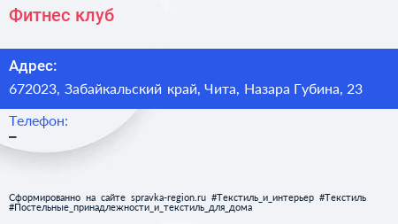Фитнес-клуб по адресу 672023, Забайкальский край, Чита, Назара Губина, 23 в дальнейшем Организация, размещена в следующих категориях: