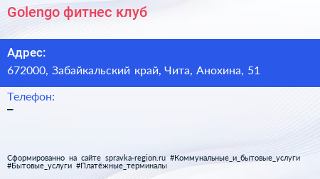 Golengo, фитнес-клуб по адресу 672000, Забайкальский край, Чита, Анохина, 51 в дальнейшем Организация, размещена в следующих категориях: