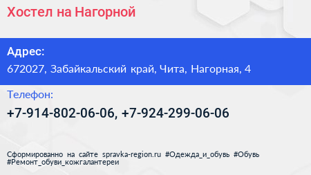 Хостел на Нагорной по адресу 672027, Забайкальский край, Чита, Нагорная, 4 в дальнейшем Организация, размещена в следующих категориях: