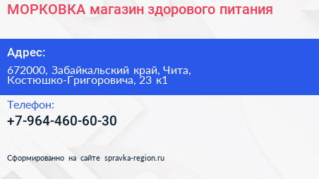 МОРКОВКА, магазин здорового питания по адресу 672000, Забайкальский край, Чита, Костюшко-Григоровича, 23 к1 в дальнейшем Организация, размещена в следующих категориях: