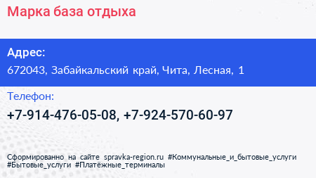 Марка, база отдыха по адресу 672043, Забайкальский край, Чита, Лесная, 1 в дальнейшем Организация, размещена в следующих категориях: