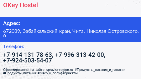 OKey Hostel! по адресу 672039, Забайкальский край, Чита, Николая Островского, 6 в дальнейшем Организация, размещена в следующих категориях: