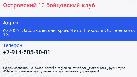 Островский 13, бойцовский клуб по адресу 672039, Забайкальский край, Чита, Николая Островского, 13 в дальнейшем Организация, размещена в следующих категориях: