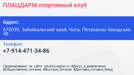 ПЛАЦДАРМ, спортивный клуб по адресу 672039, Забайкальский край, Чита, Петровско-Заводская, 48 в дальнейшем Организация, размещена в следующих категориях: