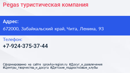 Pegas, туристическая компания по адресу 672000, Забайкальский край, Чита, Ленина, 93 в дальнейшем Организация, размещена в следующих категориях: