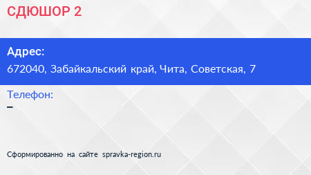 СДЮШОР №2 по адресу 672040, Забайкальский край, Чита, Советская, 7 в дальнейшем Организация, размещена в следующих категориях: