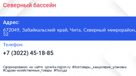 Северный, бассейн по адресу 672049, Забайкальский край, Чита, Северный микрорайон, 52 в дальнейшем Организация, размещена в следующих категориях: