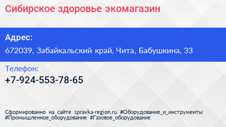 Сибирское здоровье, экомагазин по адресу 672039, Забайкальский край, Чита, Бабушкина, 33 в дальнейшем Организация, размещена в следующих категориях: