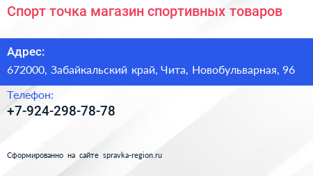 Спорт-точка, магазин спортивных товаров по адресу 672000, Забайкальский край, Чита, Новобульварная, 96 в дальнейшем Организация, размещена в следующих категориях: