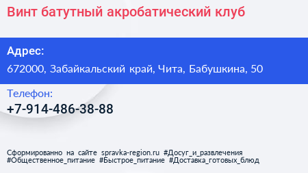 Винт, батутный акробатический клуб по адресу 672000, Забайкальский край, Чита, Бабушкина, 50 в дальнейшем Организация, размещена в следующих категориях: