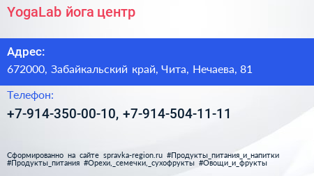 YogaLab, йога-центр по адресу 672000, Забайкальский край, Чита, Нечаева, 81 в дальнейшем Организация, размещена в следующих категориях: