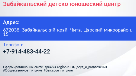 Забайкальский детско-юношеский центр по адресу 672038, Забайкальский край, Чита, Царский микрорайон, 15 в дальнейшем Организация, размещена в следующих категориях:
