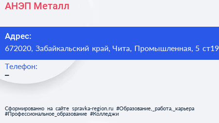 АНЭП-Металл по адресу 672020, Забайкальский край, Чита, Промышленная, 5 ст19 в дальнейшем Организация, размещена в следующих категориях: