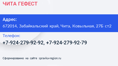 ЧИТА-ГЕФЕСТ по адресу 672014, Забайкальский край, Чита, Ковыльная, 27Б ст2 в дальнейшем Организация, размещена в следующих категориях: