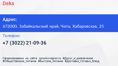 Deks по адресу 672000, Забайкальский край, Чита, Хабаровская, 25 в дальнейшем Организация, размещена в следующих категориях: