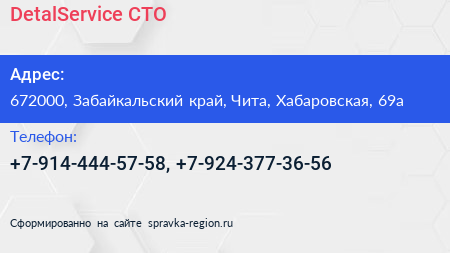 DetalService, СТО по адресу 672000, Забайкальский край, Чита, Хабаровская, 69а в дальнейшем Организация, размещена в следующих категориях:
