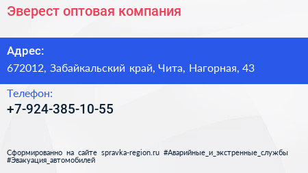 Эверест, оптовая компания по адресу 672012, Забайкальский край, Чита, Нагорная, 43 в дальнейшем Организация, размещена в следующих категориях:
