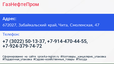 ГазНефтеПром по адресу 672027, Забайкальский край, Чита, Смоленская, 47 в дальнейшем Организация, размещена в следующих категориях: