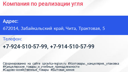 Компания по реализации угля по адресу 672014, Забайкальский край, Чита, Трактовая, 5 в дальнейшем Организация, размещена в следующих категориях: