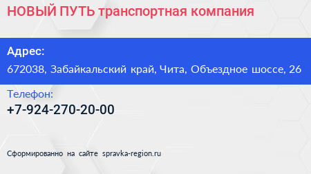 НОВЫЙ ПУТЬ, транспортная компания по адресу 672038, Забайкальский край, Чита, Объездное шоссе, 26 в дальнейшем Организация, размещена в следующих категориях: