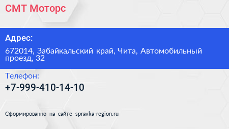 СМТ-Моторс по адресу 672014, Забайкальский край, Чита, Автомобильный проезд, 32 в дальнейшем Организация, размещена в следующих категориях: