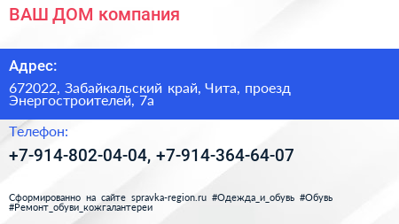 ВАШ ДОМ, компания по адресу 672022, Забайкальский край, Чита, проезд Энергостроителей, 7а в дальнейшем Организация, размещена в следующих категориях: