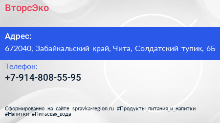 ВторсЭко по адресу 672040, Забайкальский край, Чита, Солдатский тупик, 6Б в дальнейшем Организация, размещена в следующих категориях: