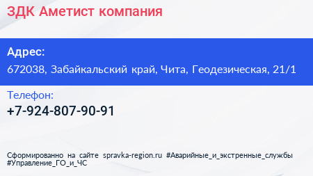 ЗДК Аметист, компания по адресу 672038, Забайкальский край, Чита, Геодезическая, 21/1 в дальнейшем Организация, размещена в следующих категориях: