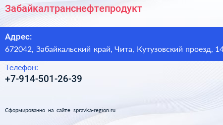 Забайкалтранснефтепродукт по адресу 672042, Забайкальский край, Чита, Кутузовский проезд, 14 в дальнейшем Организация, размещена в следующих категориях: