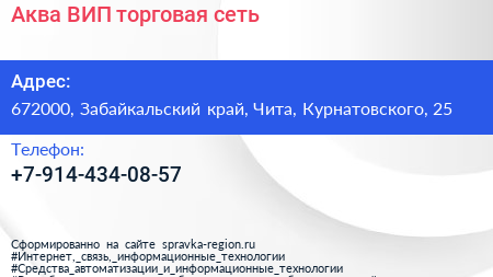 Аква ВИП, торговая сеть по адресу 672000, Забайкальский край, Чита, Курнатовского, 25 в дальнейшем Организация, размещена в следующих категориях:
