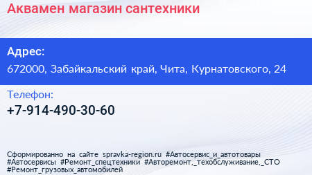 Аквамен, магазин сантехники по адресу 672000, Забайкальский край, Чита, Курнатовского, 24 в дальнейшем Организация, размещена в следующих категориях: