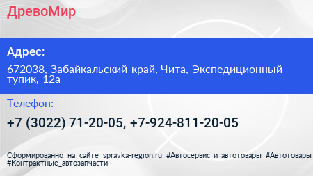 ДревоМир по адресу 672038, Забайкальский край, Чита, Экспедиционный тупик, 12а в дальнейшем Организация, размещена в следующих категориях: