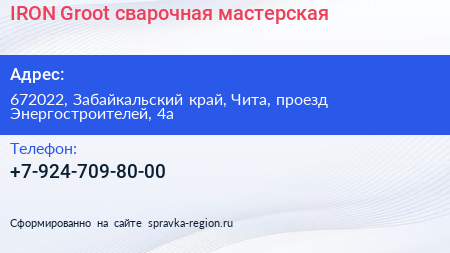 IRON Groot, сварочная мастерская по адресу 672022, Забайкальский край, Чита, проезд Энергостроителей, 4а в дальнейшем Организация, размещена в следующих категориях: