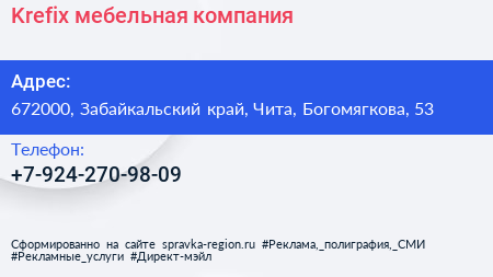 Krefix, мебельная компания по адресу 672000, Забайкальский край, Чита, Богомягкова, 53 в дальнейшем Организация, размещена в следующих категориях: