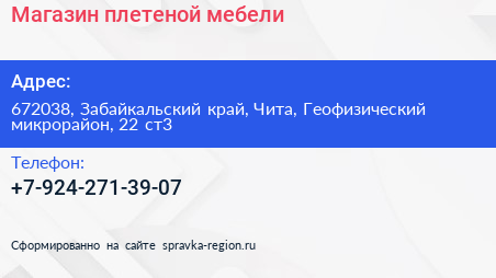 Магазин плетеной мебели по адресу 672038, Забайкальский край, Чита, Геофизический микрорайон, 22 ст3 в дальнейшем Организация, размещена в следующих категориях: