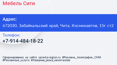Мебель-Сити по адресу 672030, Забайкальский край, Чита, Космонавтов, 15г ст2 в дальнейшем Организация, размещена в следующих категориях: