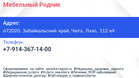 Мебельный Родник по адресу 672020, Забайкальский край, Чита, Лазо, 112 к4 в дальнейшем Организация, размещена в следующих категориях: