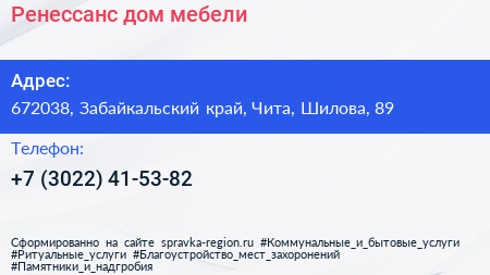 Ренессанс, дом мебели по адресу 672038, Забайкальский край, Чита, Шилова, 89 в дальнейшем Организация, размещена в следующих категориях:
