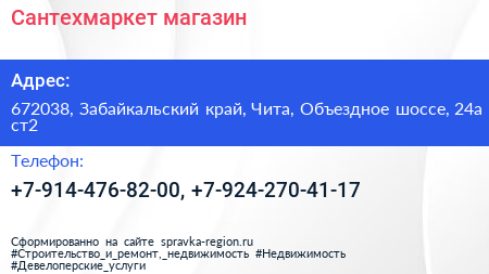 Сантехмаркет, магазин по адресу 672038, Забайкальский край, Чита, Объездное шоссе, 24а ст2 в дальнейшем Организация, размещена в следующих категориях: