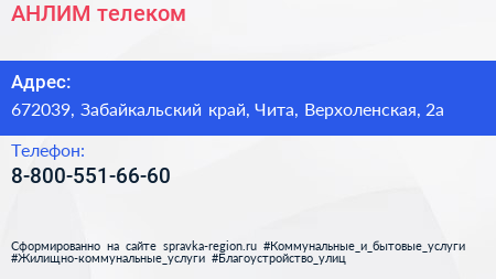 АНЛИМ телеком по адресу 672039, Забайкальский край, Чита, Верхоленская, 2а в дальнейшем Организация, размещена в следующих категориях: