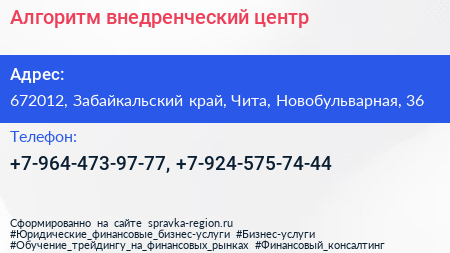 Алгоритм, внедренческий центр по адресу 672012, Забайкальский край, Чита, Новобульварная, 36 в дальнейшем Организация, размещена в следующих категориях: