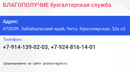 БЛАГОПОЛУЧИЕ, бухгалтерская служба по адресу 672039, Забайкальский край, Чита, Красноярская, 32а к2 в дальнейшем Организация, размещена в следующих категориях:
