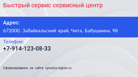 Быстрый сервис, сервисный центр по адресу 672000, Забайкальский край, Чита, Бабушкина, 98 в дальнейшем Организация, размещена в следующих категориях: